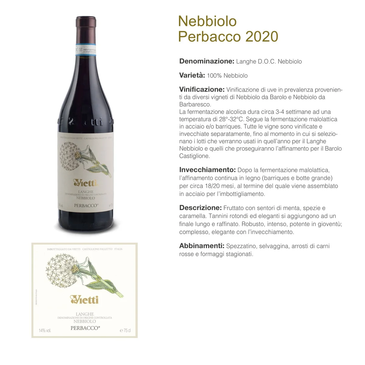 Vinificação: Este Langhe Nebbiolo, conhecido como "Perbacco", é elaborado a partir de uvas cuidadosamente selecionadas dos vinhedos de Nebbiolo da Barolo e Barbaresco. A fermentação alcoólica ocorre ao longo de 3-4 semanas a temperaturas controladas entre 28°-32°C, seguida pela fermentação maloláctica em aço e/ou barris de carvalho. Cada parcela de vinha é vinificada e envelhecida separadamente até o momento em que são escolhidos os lotes destinados ao Langhe Nebbiolo e aqueles que continuarão a envelhecer para o Barolo Castiglione.